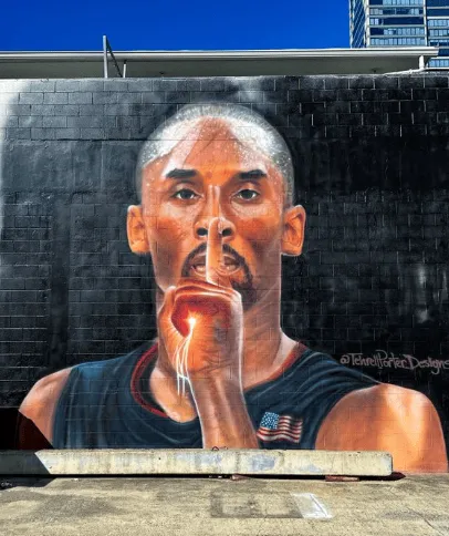 该壁画还原了科比曾经在奥运会比赛中摆出的经典闭嘴手势。